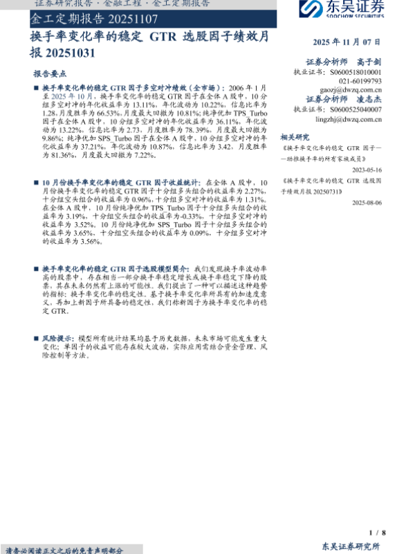 【东吴证券】【202511】换手率变化率的稳定 GTR选股因子绩效月报-8页 证券期货研究报告