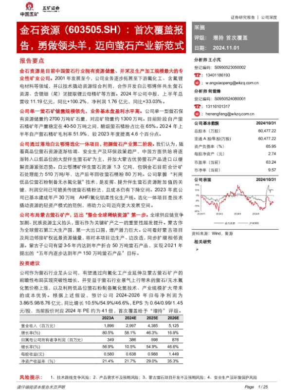 【五矿证券】【20241101】20241101-五矿证券-金石资源-603505.SH-首次覆盖报告,勇做领头羊,迈向萤石产业新范式-25页 行业研究