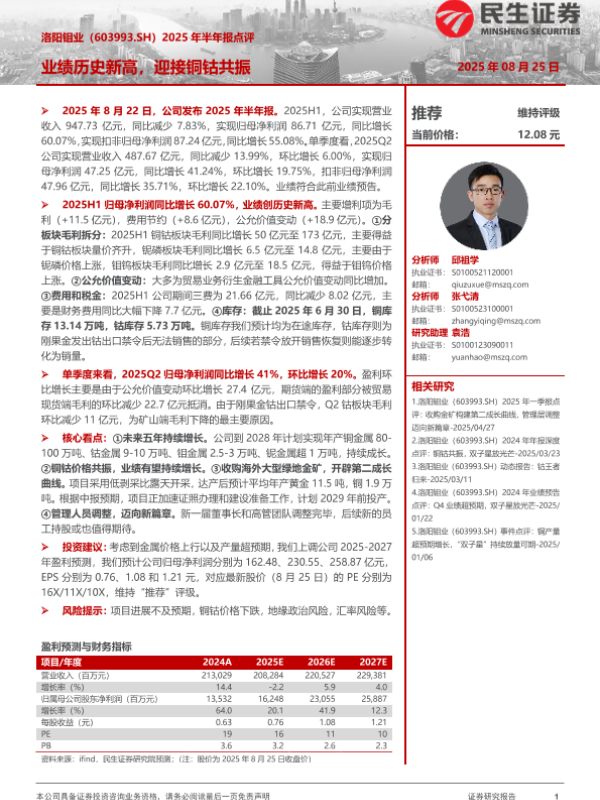 【民生证券】【202508】洛阳钼业(603993)2025年半年报点评:业绩历史新高,迎接铜钴共振-20页 证券期货研究报告