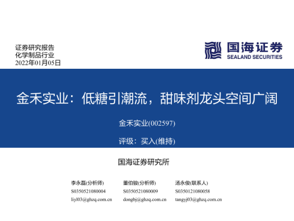 【国海证券】【20220105】金禾实业:低糖引潮流,甜味剂龙头空间广阔-74页 行业研究