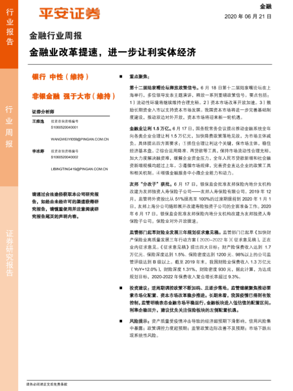 【平安证券】【20200621】金融行业周报:金融业改革提速,进一步让利实体经济-8页 行业研究