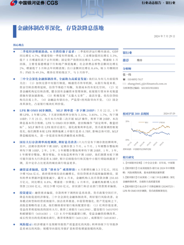 【银河证券】【20240729】银行业行业动态报告:金融体制改革深化,存贷款降息落地-21页 行业研究
