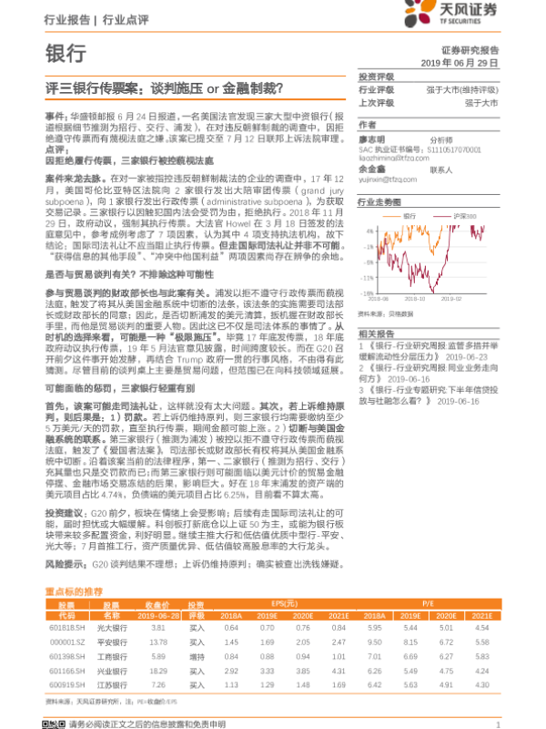 【天风证券】【20190629】评三银行传票案:谈判施压or金融制裁?-5页 行业研究