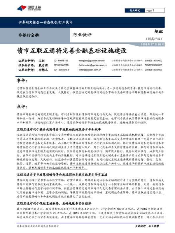 【国信证券】【20200720】非银行金融:债市互联互通将完善金融基础设施建设-6页 行业研究
