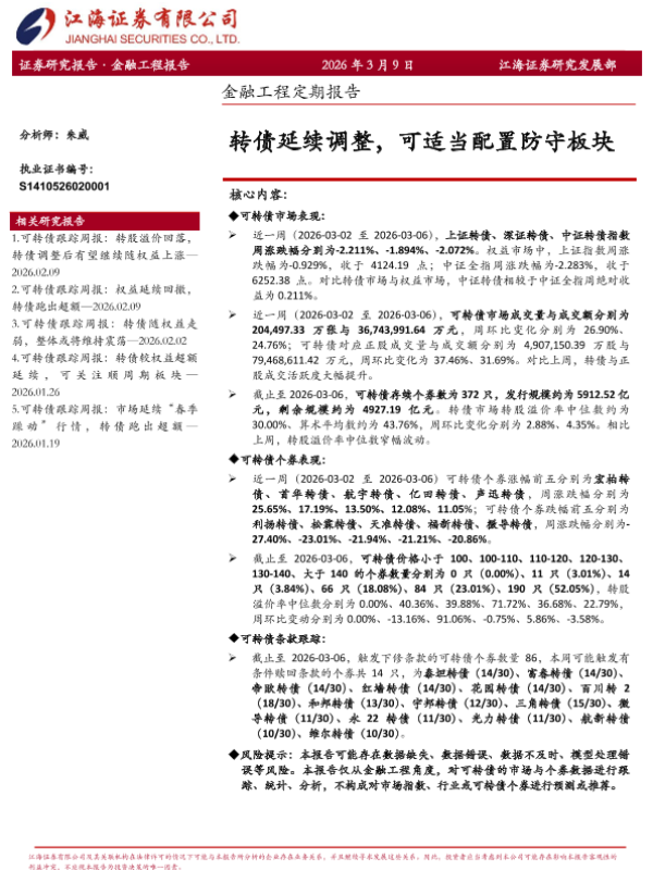 【江海证券】【202603】转债延续调整,可适当配置防守板块-12页 证券期货研究报告