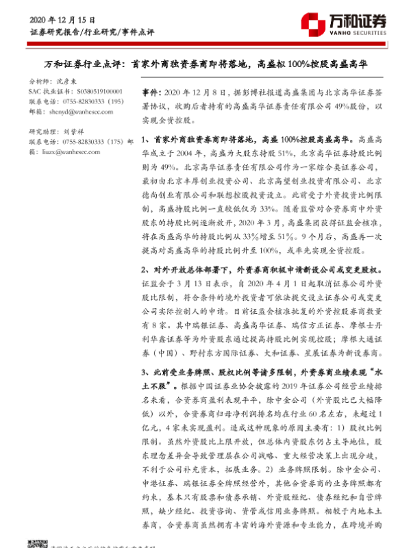 【万和证券】【20201215】证券行业点评:首家外商独资券商即将落地,高盛拟100%控股高盛高华-4页 行业研究