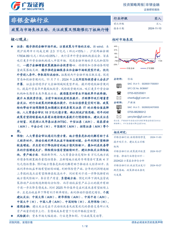 【广发证券】【20241110】非银金融行业投资策略周报:政策与市场良性互动,关注政策及预期催化下板块行情-12页 行业研究