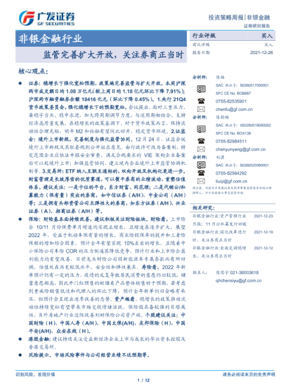 【广发证券】【20211226】非银金融行业:监管完善扩大开放,关注券商正当时-12页 行业研究