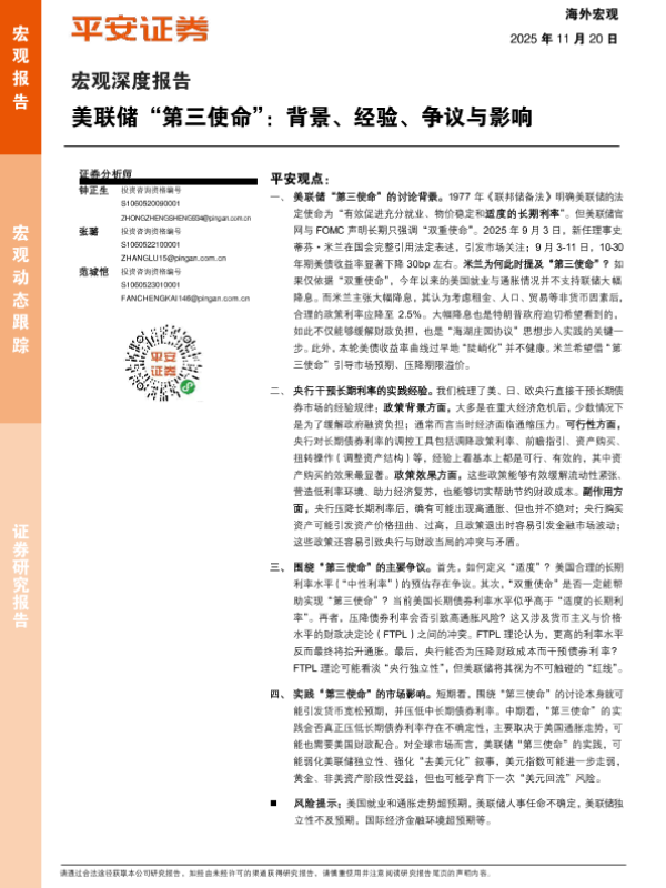 【平安证券】【2025】美联储“第三使命”:背景、经验、争议与影响-16页 证券期货研究报告