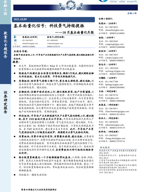 【国泰君安证券】【20211009】10月基本面量化月报:基本面量化信号,科技景气持续提振-21页 行业研究