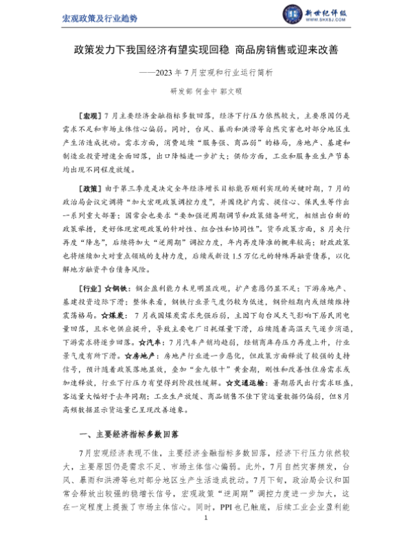 【新世纪评级】【20230701】政策发力下我国经济有望实现回稳 商品房销售或迎来改善——2023年7月宏观和行业运行简析-11页 行业研究