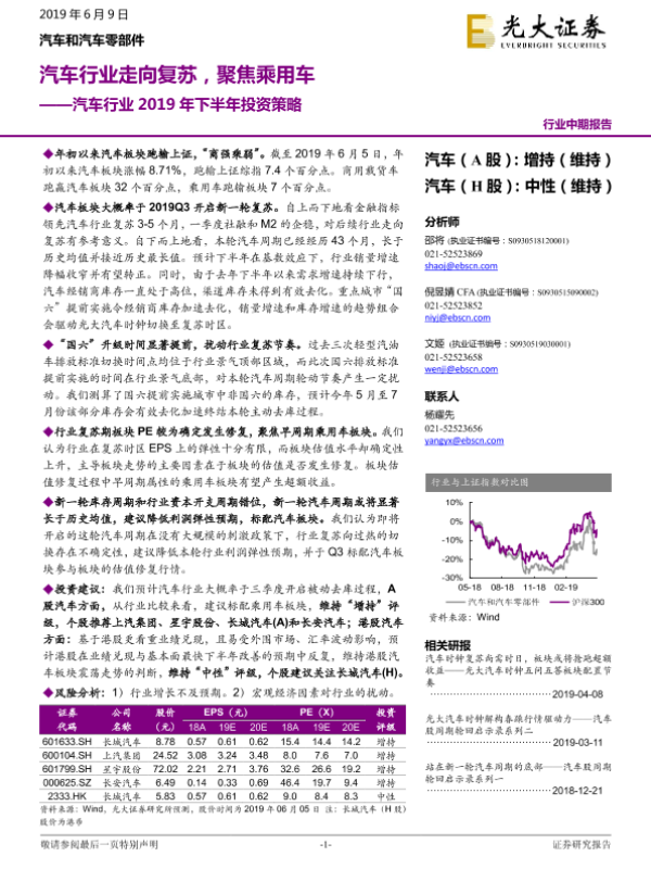 【光大证券】【20190609】汽车行业2019年下半年投资策略:汽车行业走向复苏,聚焦乘用车-27页 行业研究