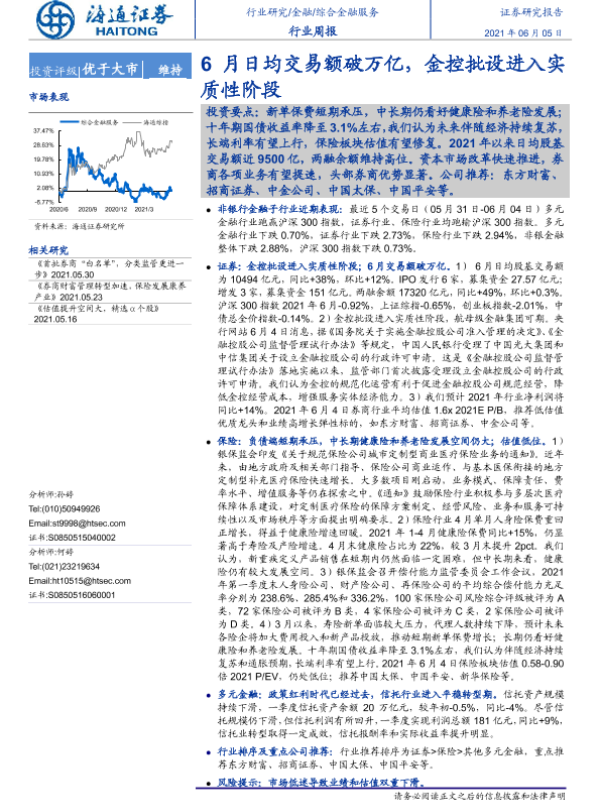【海通证券】【20210605】综合金融服务行业周报:6月日均交易额破万亿,金控批设进入实质性阶段-9页 行业研究