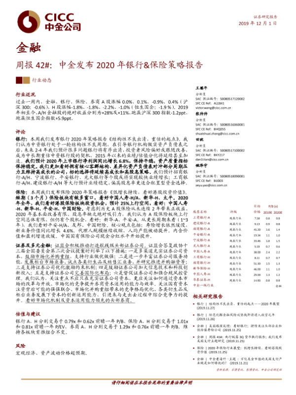【中金公司】【20191201】金融周报42#:中金发布2020年银行&保险策略报告-15页 行业研究