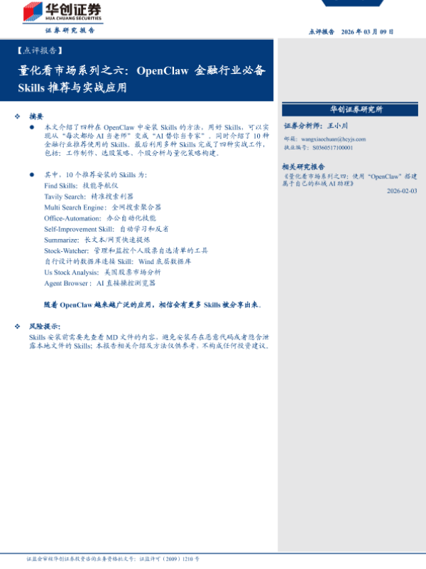 【华创证券】【202603】量化看市场系列之六:OpenClaw金融行业必备 Skills推荐与实战应用-26页 证券期货研究报告