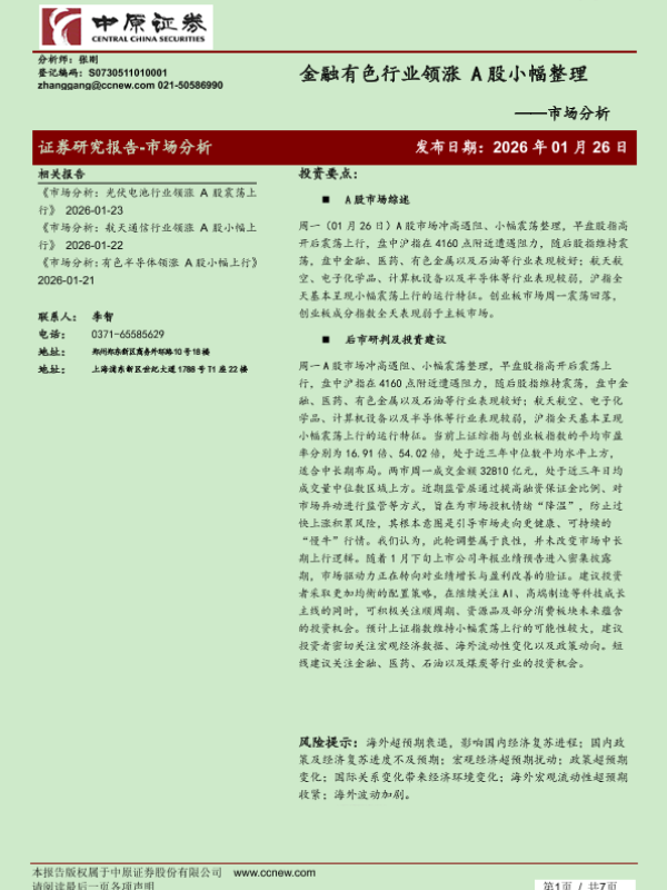 【中原证券】【202601】金融有色行业领涨 A股小幅整理-7页 证券期货研究报告