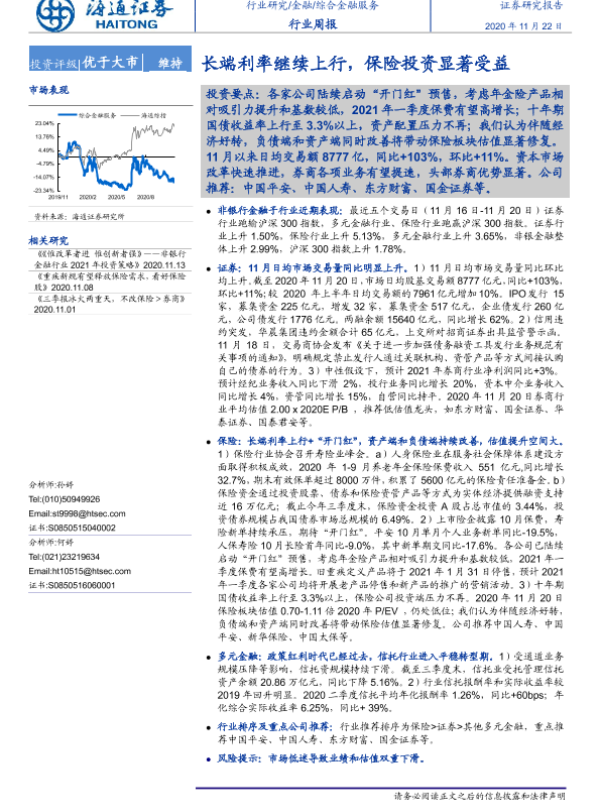 【海通证券】【20201122】综合金融服务行业周报:长端利率继续上行,保险投资显著受益-10页 行业研究