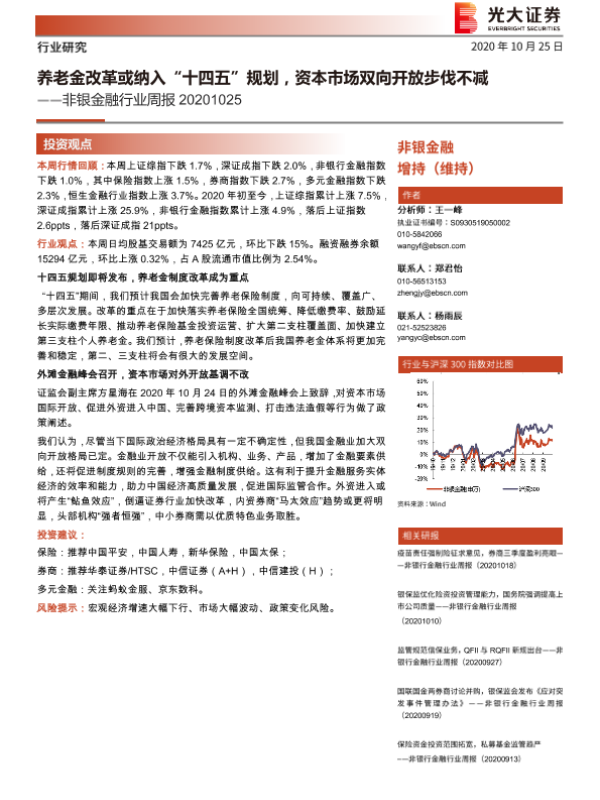 【光大证券】【20201025】非银金融行业周报:养老金改革或纳入“十四五”规划,资本市场双向开放步伐不减-11页 行业研究