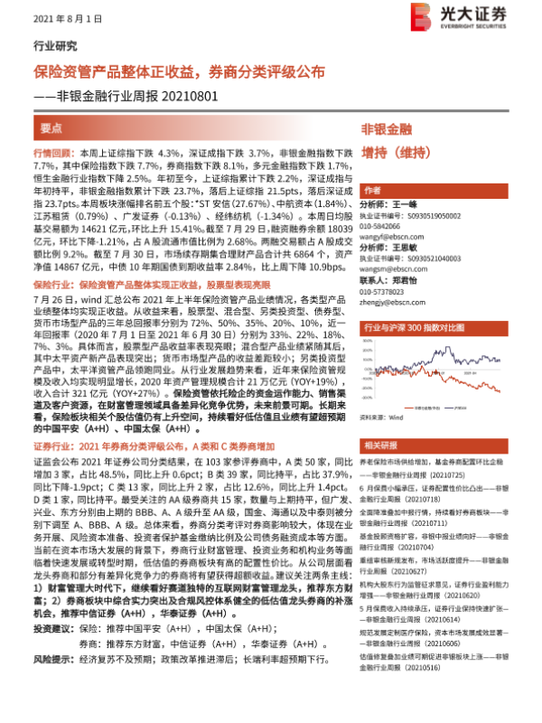 【光大证券】【20210801】非银金融行业周报:保险资管产品整体正收益,券商分类评级公布-11页 行业研究