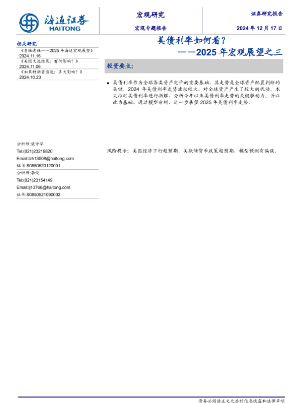 【海通证券】【20241217】2025年宏观展望之三:美债利率如何看?-13页 宏观策略
