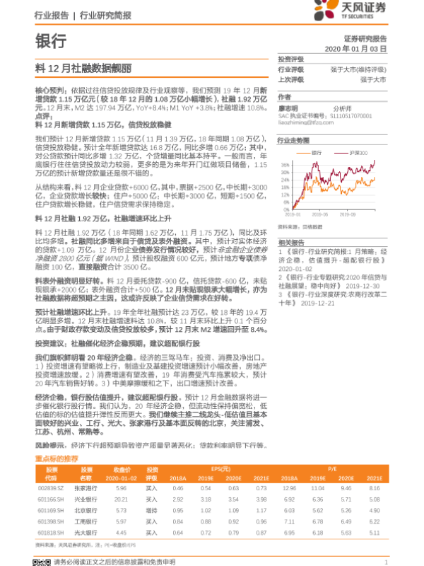 【天风证券】【20200103】料12月社融数据靓丽-5页 行业研究