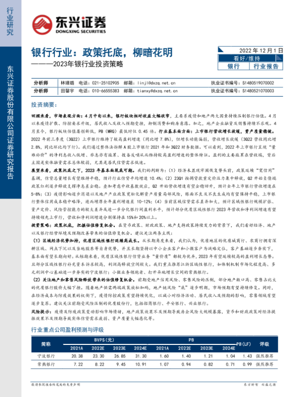 【东兴证券】【20221201】2023年银行业投资策略:政策托底,柳暗花明-24页 行业研究