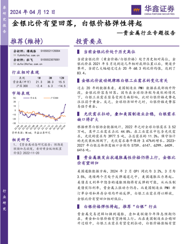 【华鑫证券】【20240412】2024-04-13-贵金属行业专题报告-金银比价有望回落-白银价格弹性将起-23页 行业研究
