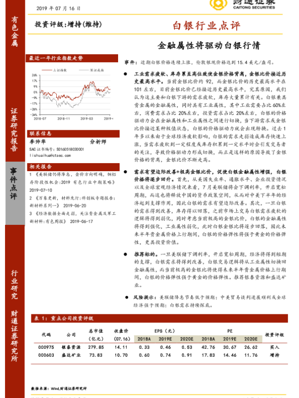 【财通证券】【20190716】财通证券-白银行业点评:金融属性将驱动白银行情-2页 行业研究