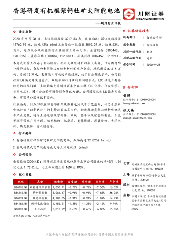【川财证券】【20200928】制造行业日报:香港研发有机框架钙钛矿太阳能电池-3页 行业研究