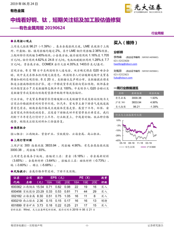 【光大证券】【20190624】20190624-光大证券-有色金属周报:中线看好铜、钛,短期关注铝及加工股估值修复-13页 行业研究