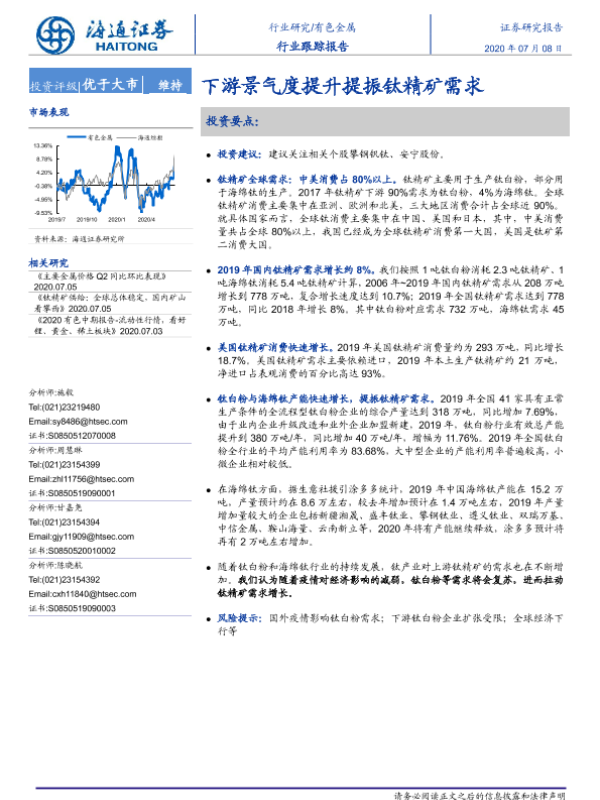 【海通证券】【20200708】有色金属行业跟踪报告:下游景气度提升提振钛精矿需求-5页 行业研究