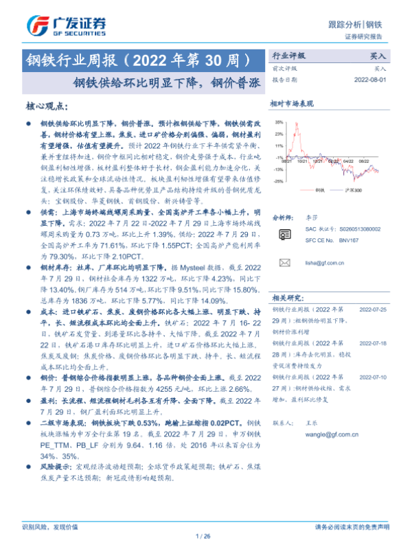 【广发证券】【20220801】钢铁行业周报(2022年第30周):钢铁供给环比明显下降,钢价普涨-26页 行业研究