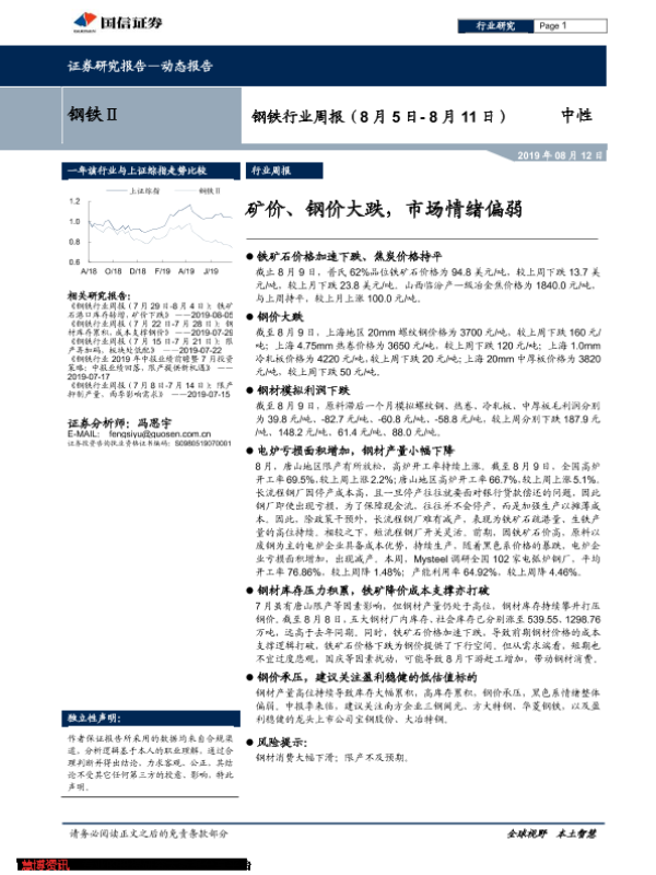 【国信证券】【20190812】20190812-国信证券-钢铁行业周报:矿价、钢价大跌,市场情绪偏弱-14页 行业研究