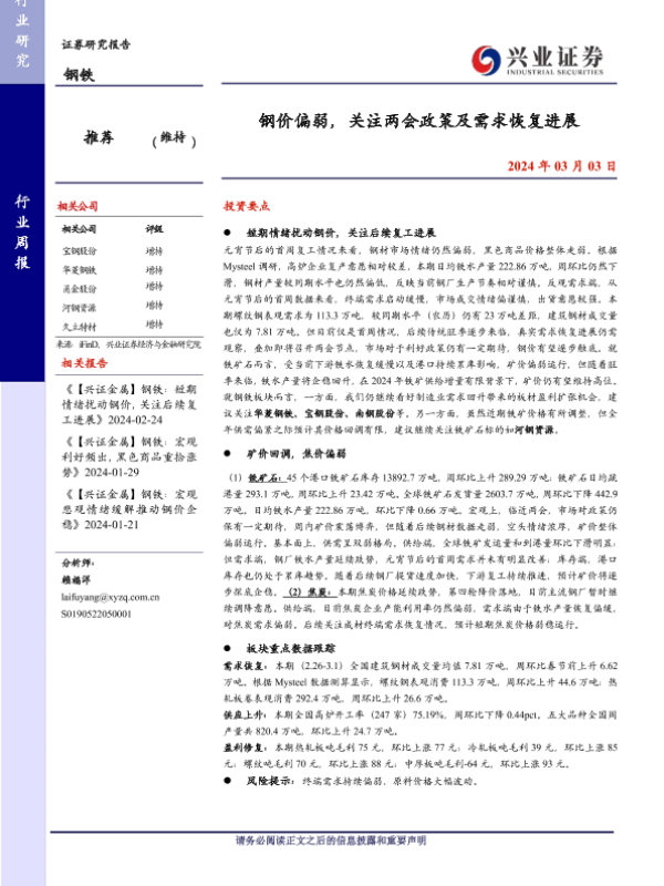 【兴业证券】【20240303】20240303-兴业证券-钢铁行业周报:钢价偏弱,关注两会政策及需求恢复进展-10页 行业研究