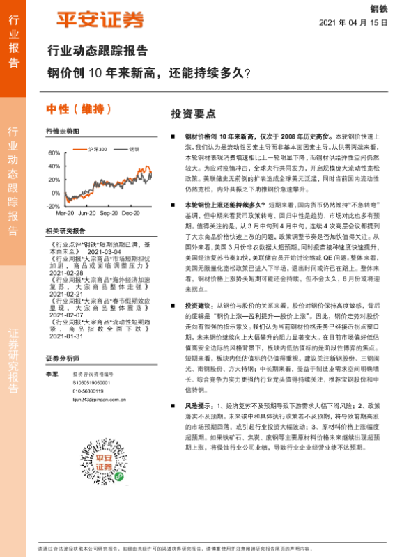 【平安证券】【20210415】钢铁行业动态跟踪报告:钢价创10年来新高,还能持续多久?-15页 行业研究
