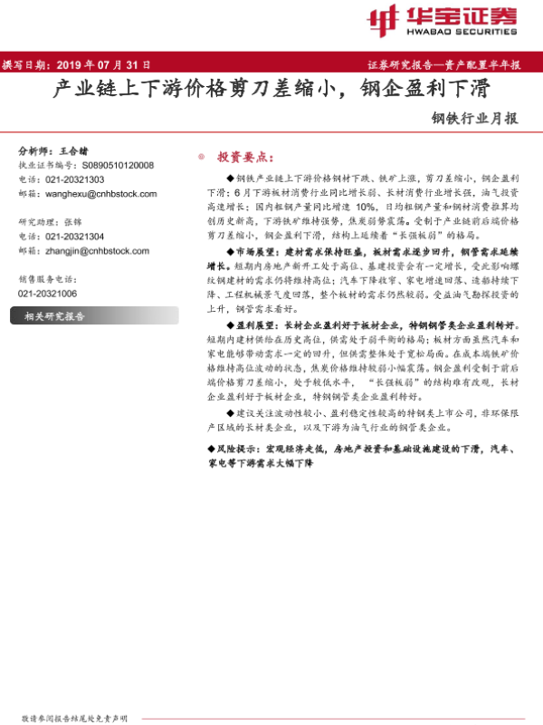 【华宝证券】【20190731】20190731-华宝证券-钢铁行业月报:产业链上下游价格剪刀差缩小,钢企盈利下滑-17页 行业研究