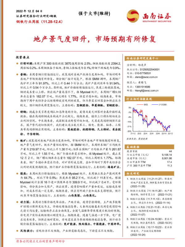 【西南证券】【20221204】20221204-西南证券-钢铁行业周报:地产景气度回升,市场预期有所修复-16页 行业研究