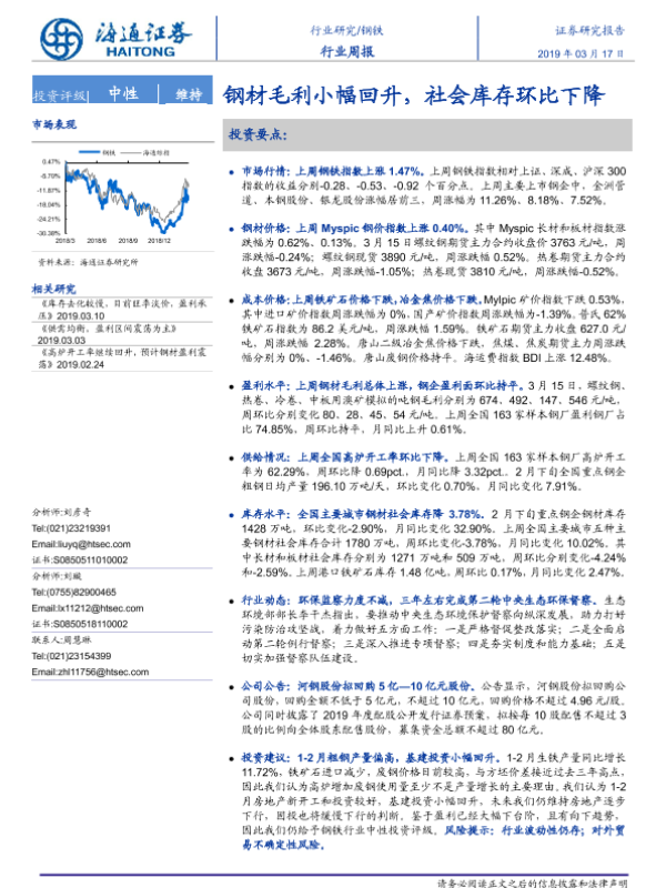 【海通证券】【20190317】20190317-海通证券-钢铁行业周报:钢材毛利小幅回升,社会库存环比下降-14页 行业研究