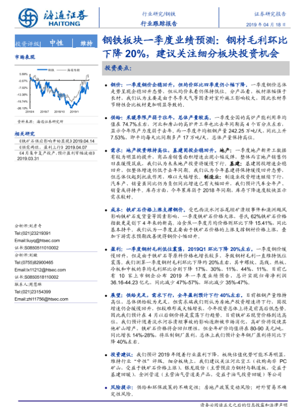 【海通证券】【20190418】钢铁板块一季度业绩预测:钢材毛利环比下降20%,建议关注细分板块投资机会-12页 行业研究
