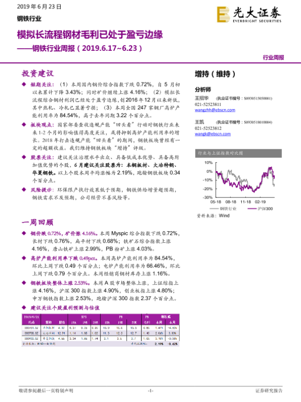 【光大证券】【20190623】20190623-光大证券-钢铁行业周报:模拟长流程钢材毛利已处于盈亏边缘-9页 行业研究