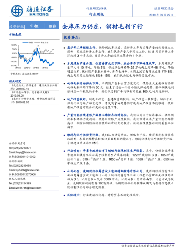 【海通证券】【20190922】20190922-海通证券-钢铁行业周报:去库压力仍在,钢材毛利下行-14页 行业研究