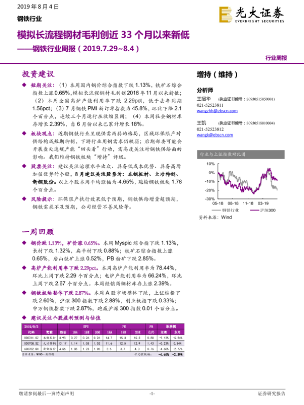 【光大证券】【20190804】钢铁行业周报:模拟长流程钢材毛利创近33个月以来新低-9页 行业研究