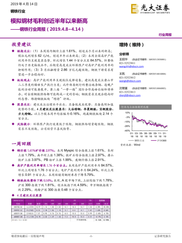 【光大证券】【20190414】20190414-光大证券-钢铁行业周报:模拟钢材毛利创近半年以来新高-10页 行业研究
