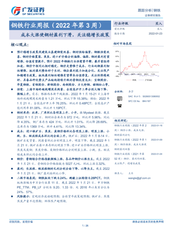 【广发证券】【20220123】20220123-广发证券-钢铁行业周报(2022年第3周):成本大涨使钢材盈利下滑,关注稳增长政策-26页 行业研究