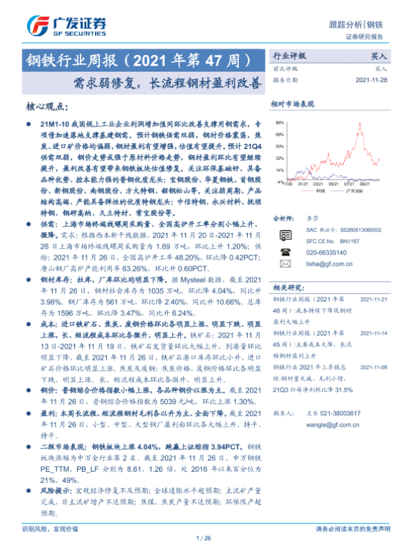 【广发证券】【20211128】20211128-广发证券-钢铁行业周报(2021年第47周):需求弱修复,长流程钢材盈利改善-26页 行业研究