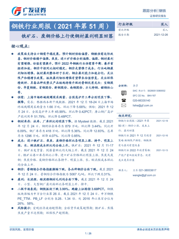 【广发证券】【20211226】20211226-广发证券-钢铁行业周报(2021年第51周):铁矿石、废钢价格上行使钢材盈利明显回落-26页 行业研究