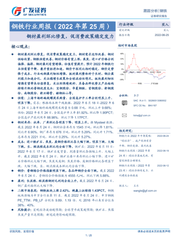 【广发证券】【20220625】20220625-广发证券-钢铁行业周报(2022年第25周):钢材盈利环比修复,促消费政策稳定发力-25页 行业研究