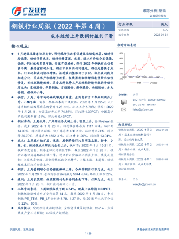 【广发证券】【20220131】钢铁行业周报(2022年第4周):成本继续上升致钢材盈利下滑-26页 行业研究