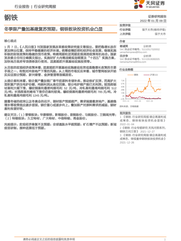 【天风证券】【20220109】20220109-天风证券-钢铁行业研究周报:冬季限产叠加基建复苏预期,钢铁板块投资机会凸显-13页 行业研究