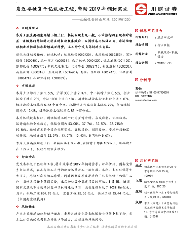 【川财证券】【20190120】机械设备行业周报:发改委批复千亿机场工程,带动2019年钢材需求-8页 行业研究
